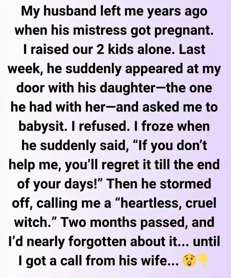 When my ex-husband showed up at my doorstep years after abandoning our family, I felt old wounds rip open in an instant. He’d left me when his mistress became pregnant, and I’d raised our two children alone while rebuilding a life he had fractured. So when he arrived—with the daughter he’d had with her—and demanded that I babysit, I stood firmly in the boundaries I’d fought to create. My refusal triggered his anger, and his parting threats echoed in my mind for weeks. But as time passed, the bitterness softened, and I tried to move on—until the phone rang one afternoon and his wife, the last person I expected to hear from, gently introduced herself.