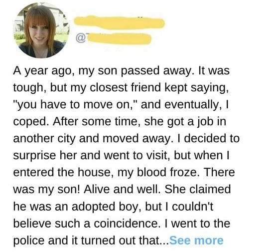 “I need to know if my son is still alive,” she told him, her hands holding her phone too roughly. “I think my friend’s adopted son might be my own.”
