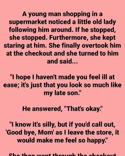 As the elderly lady turned to leave the store, the young man, now fully understanding the reason behind her request, called out in a loud and clear voice, “Goodbye, Mom!” He watched as she turned, her face lighting up with a soft, grateful smile.